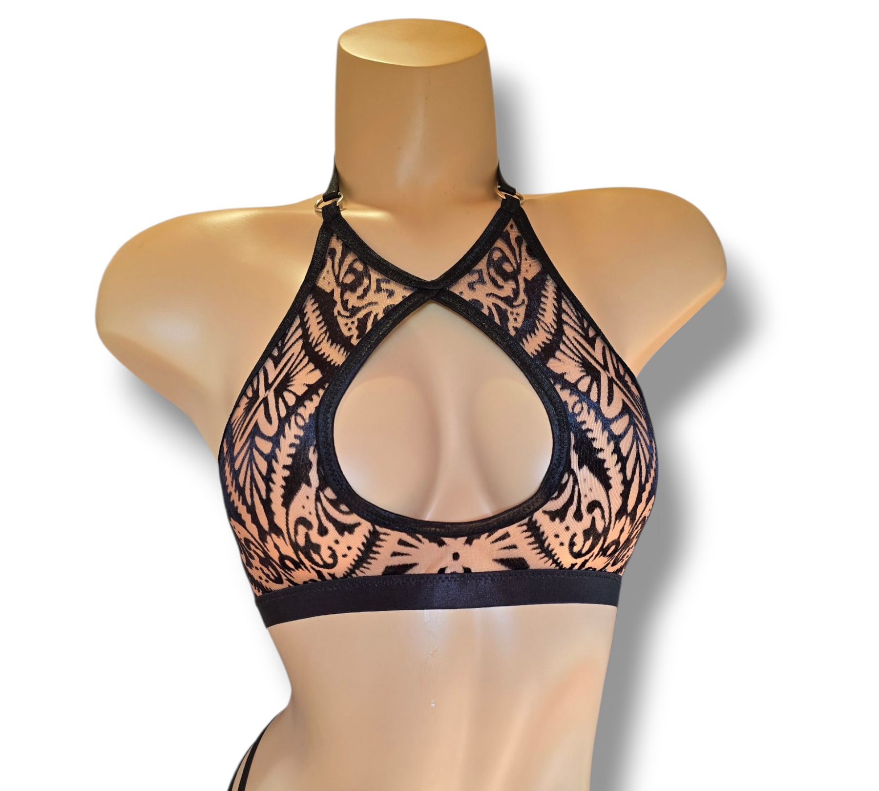 The Obsidian Bloom Bralette combines structure and seduction. Its high-neck silhouette flatters the shoulders, while the daring keyhole cutout frames the bust with just the right touch of boldness.